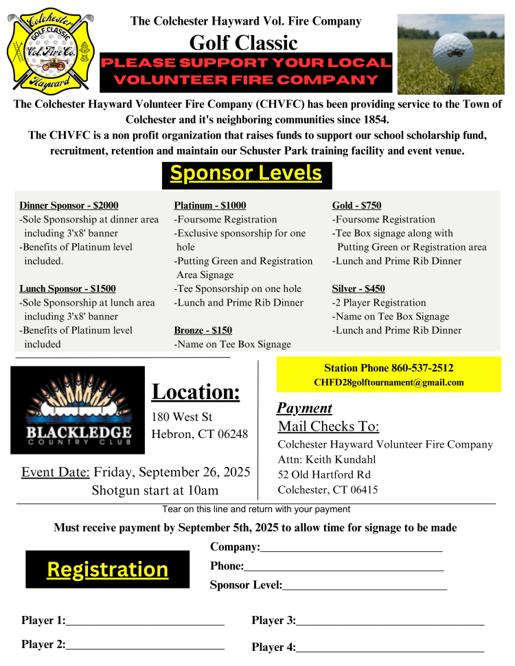 This year our golf tournament is scheduled for Friday, September 26, 2025 at Blackledge Golf Course in Hebron, CT. Please see our flyers below.
