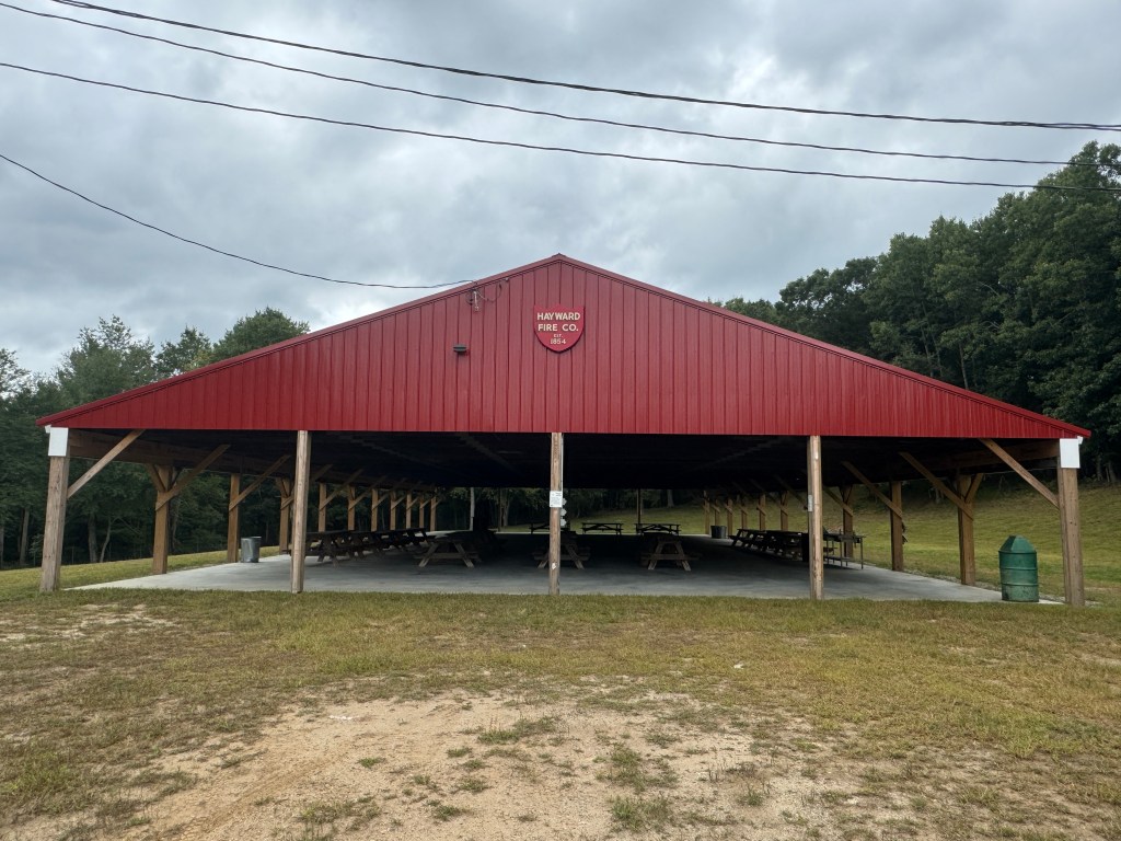 Our pavilion is a large 120’ x 60′ area outfitted with 12 picnic tables for use. We have exterior lighting and plenty of bright LED lighting under the pavilion to keep your evening event going well into the early night. We have a bon fire pit, horseshoe pits, volleyball net and various lawn games to use. We have a large parking area for more guests than you can think of to invite. We have restroom facilities available.
